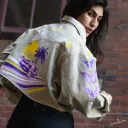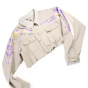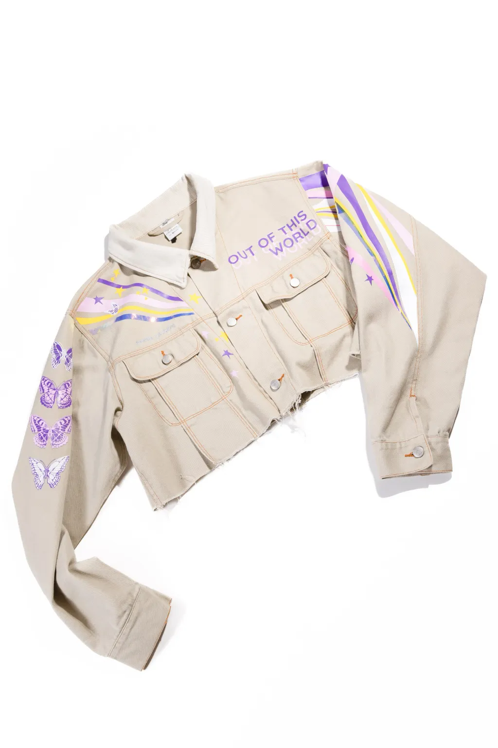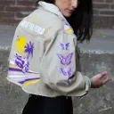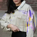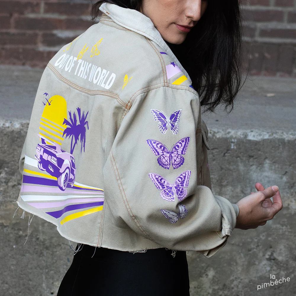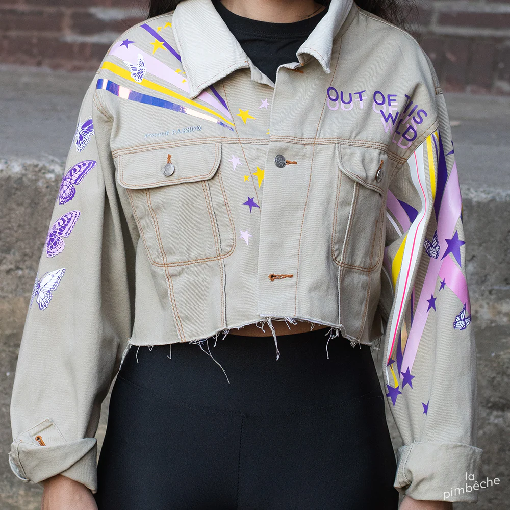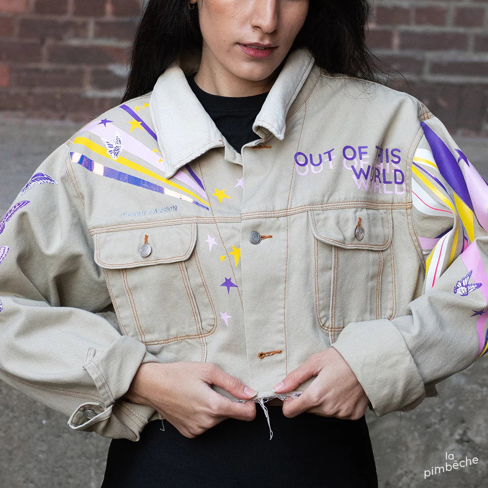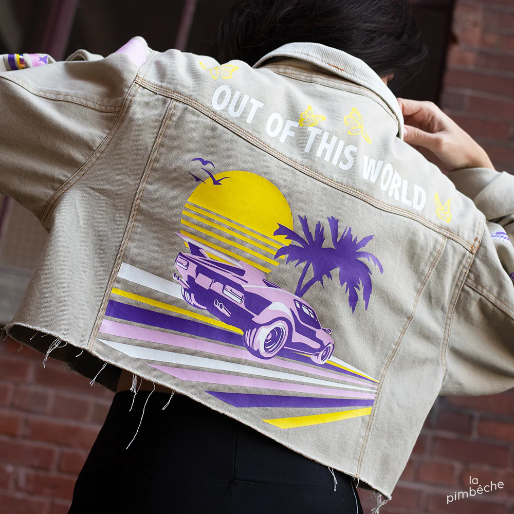 Cette veste en jeans fait partie d'une série de vestes confectionnées par La Pimbêche. Chaque œuvre unique est composée de couches de vinyle à transfert de chaleur. La veste devient la toile et votre corps le permet l'art de voyager.