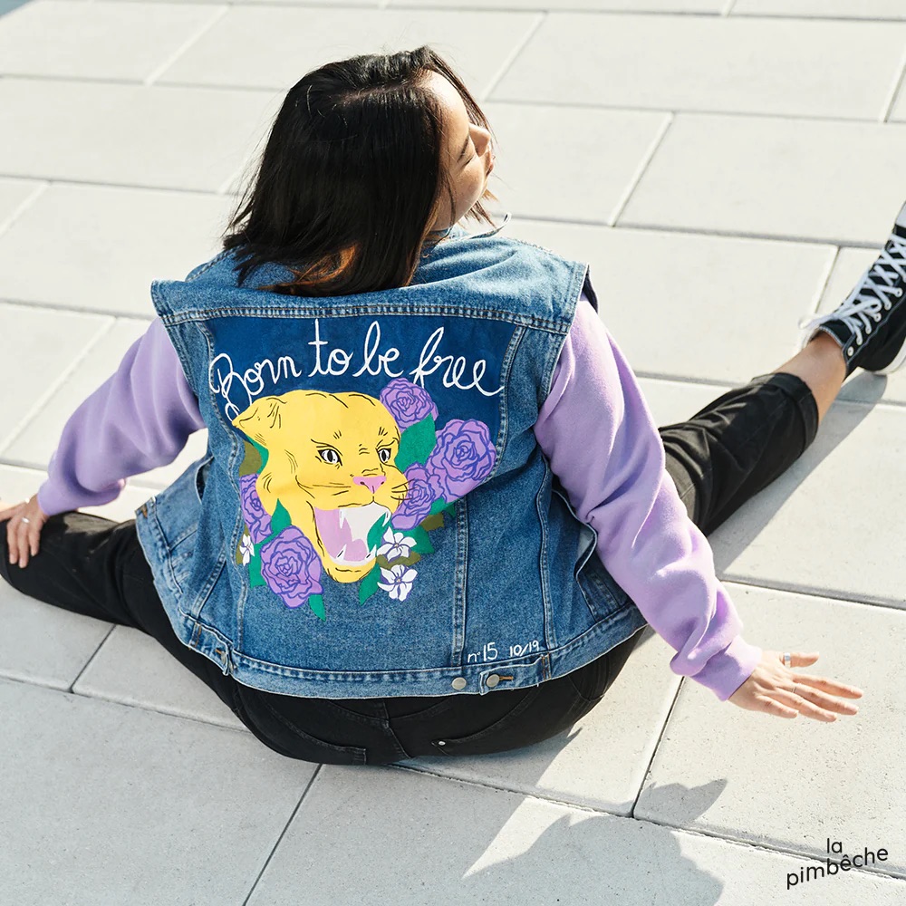 Une veste en jeans unique en son genre, confectionnée par La Pimbêche. Chaque œuvre d'art est peinte avec de la peinture acrylique pour une longue durée de vie. Chaque veste est une toile avec laquelle vous permettez l'oeuvre de voyager.