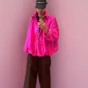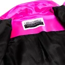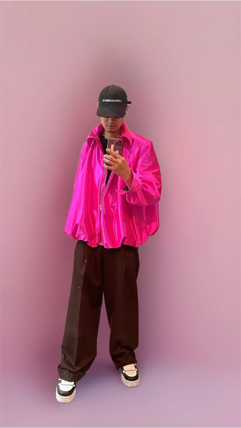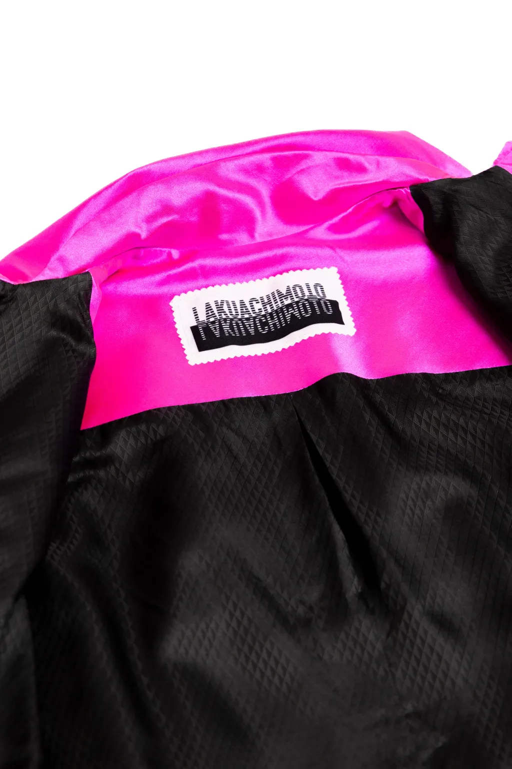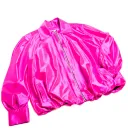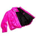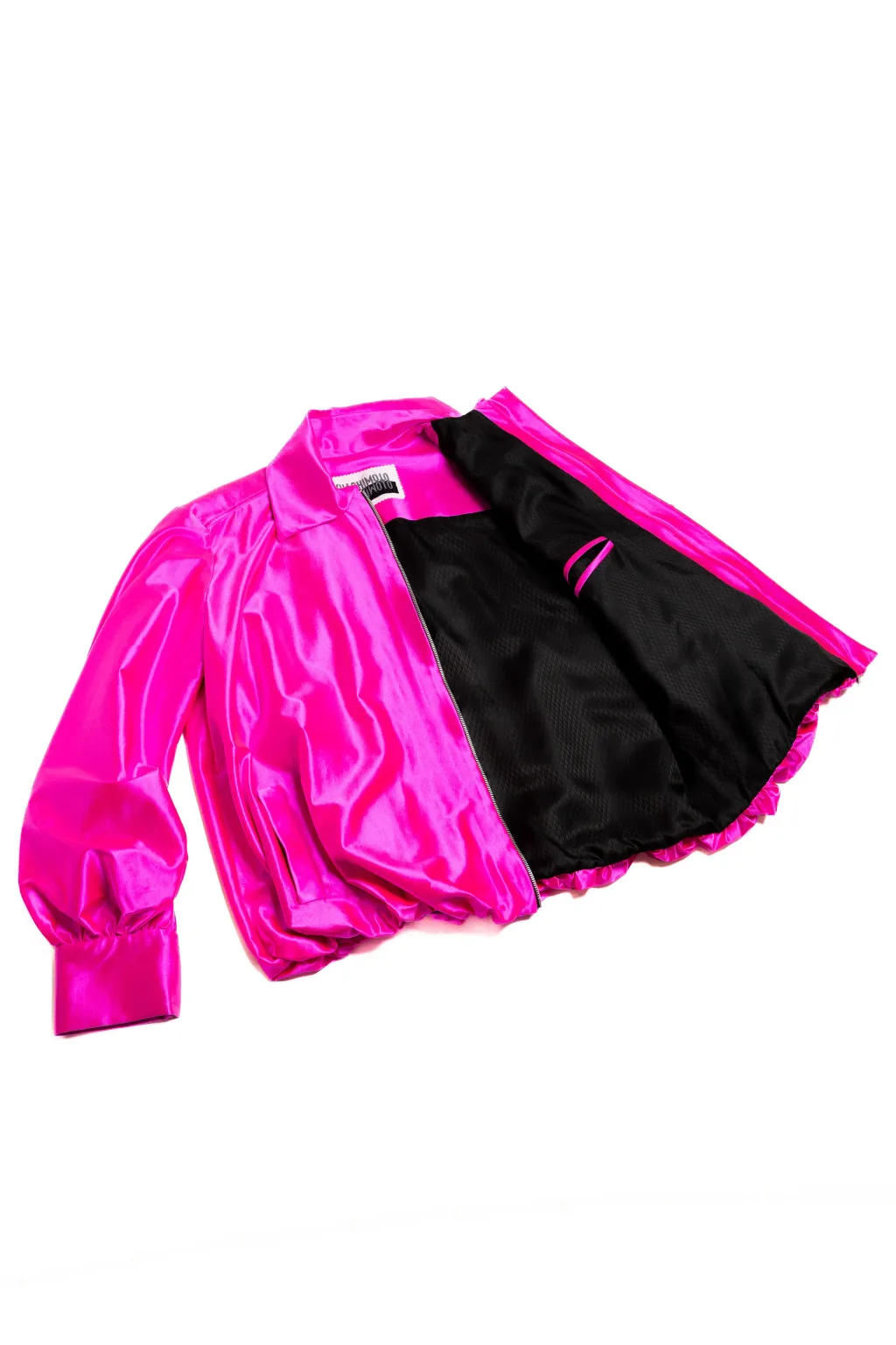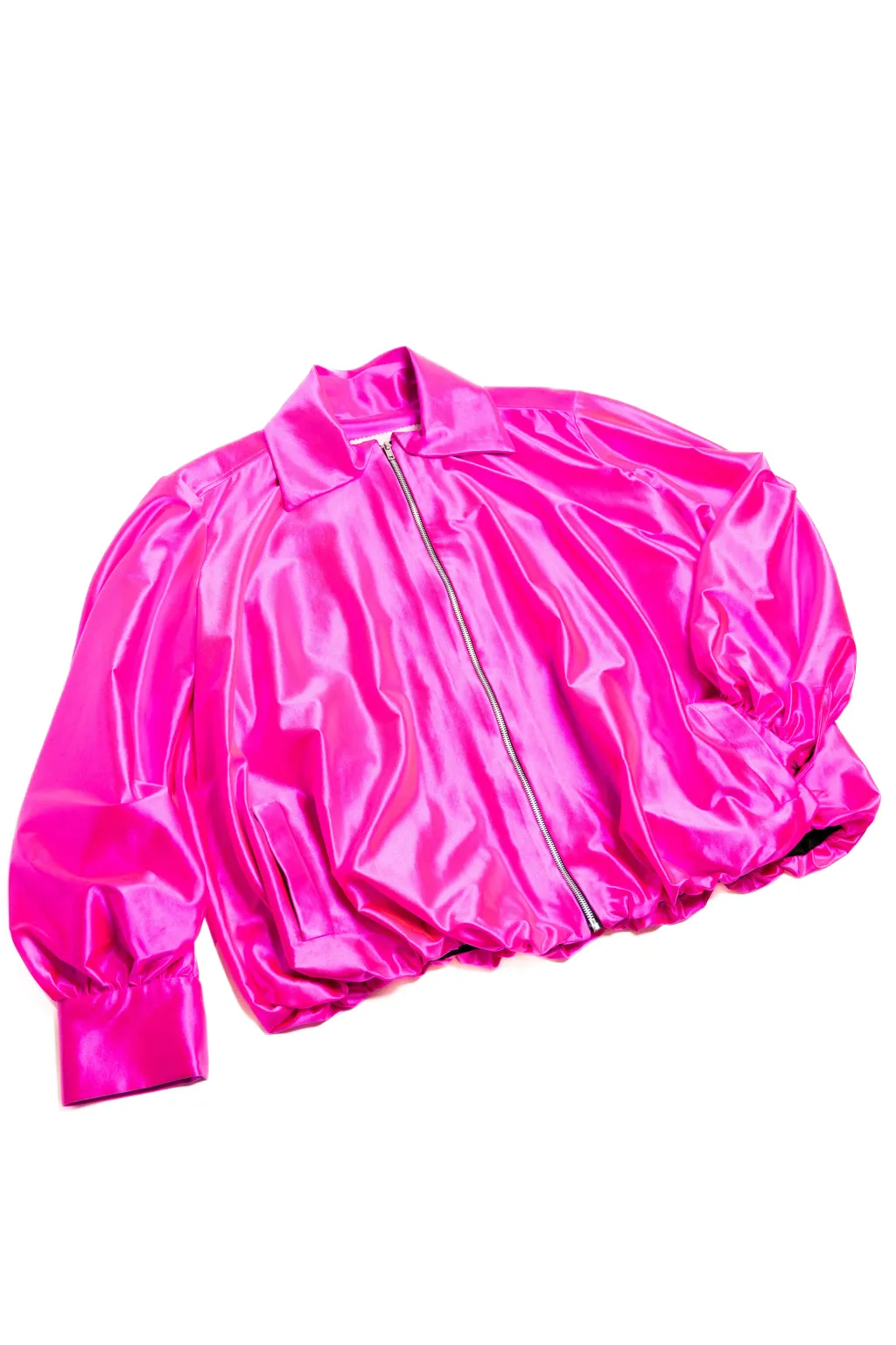 Blouson en satin magenta à col chemisier et poignets carré à deux boutons-pression, avec manches bouffantes froncées aux poignets, fermeture à glissière au devant, avec 2 poches latérales, poche passe-poilée à l'intérieur, avec doublure en rayonne sur l'ensemble.