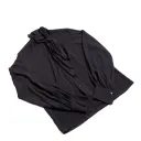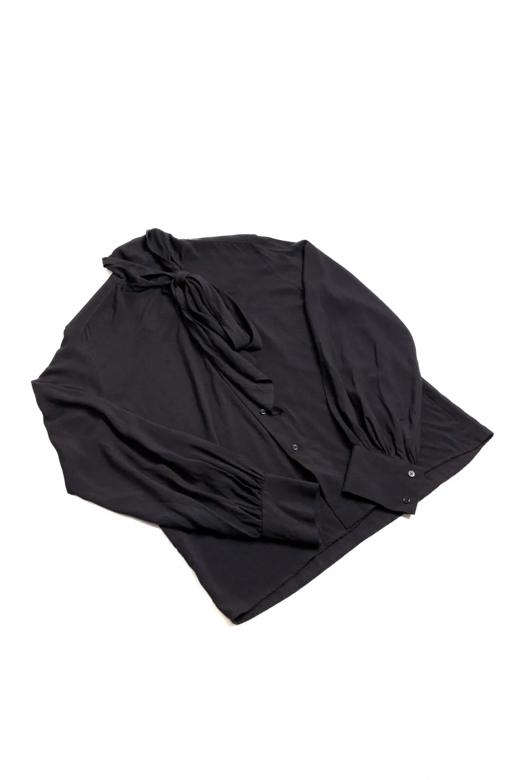 Chemise en bambou certifié Oeko-Tex noir à col foulard et poignets carré à deux boutons, avec manches bouffantes froncées aux poignets et patte de boutonnage.