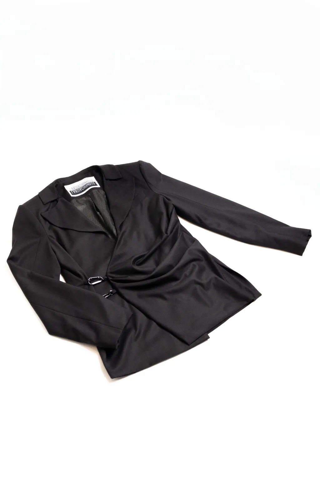 Veston asymétrique drapé en sergé de polyester mélangé avec col et revers tailleur, avec épaulettes et mousquetons avec logo, à l’intérieur et à l’extérieur. Poche passepoilée à l’intérieur. Fentes latérales. Doublure en rayonne sur l’ensemble.