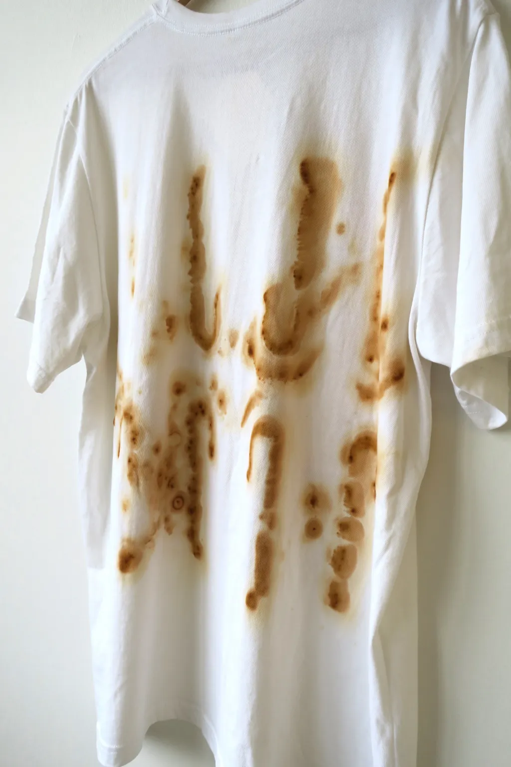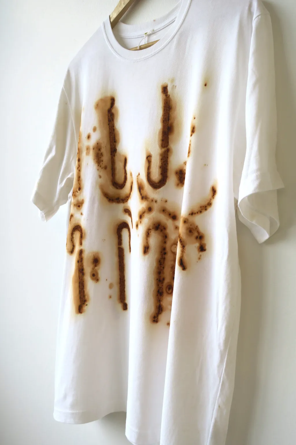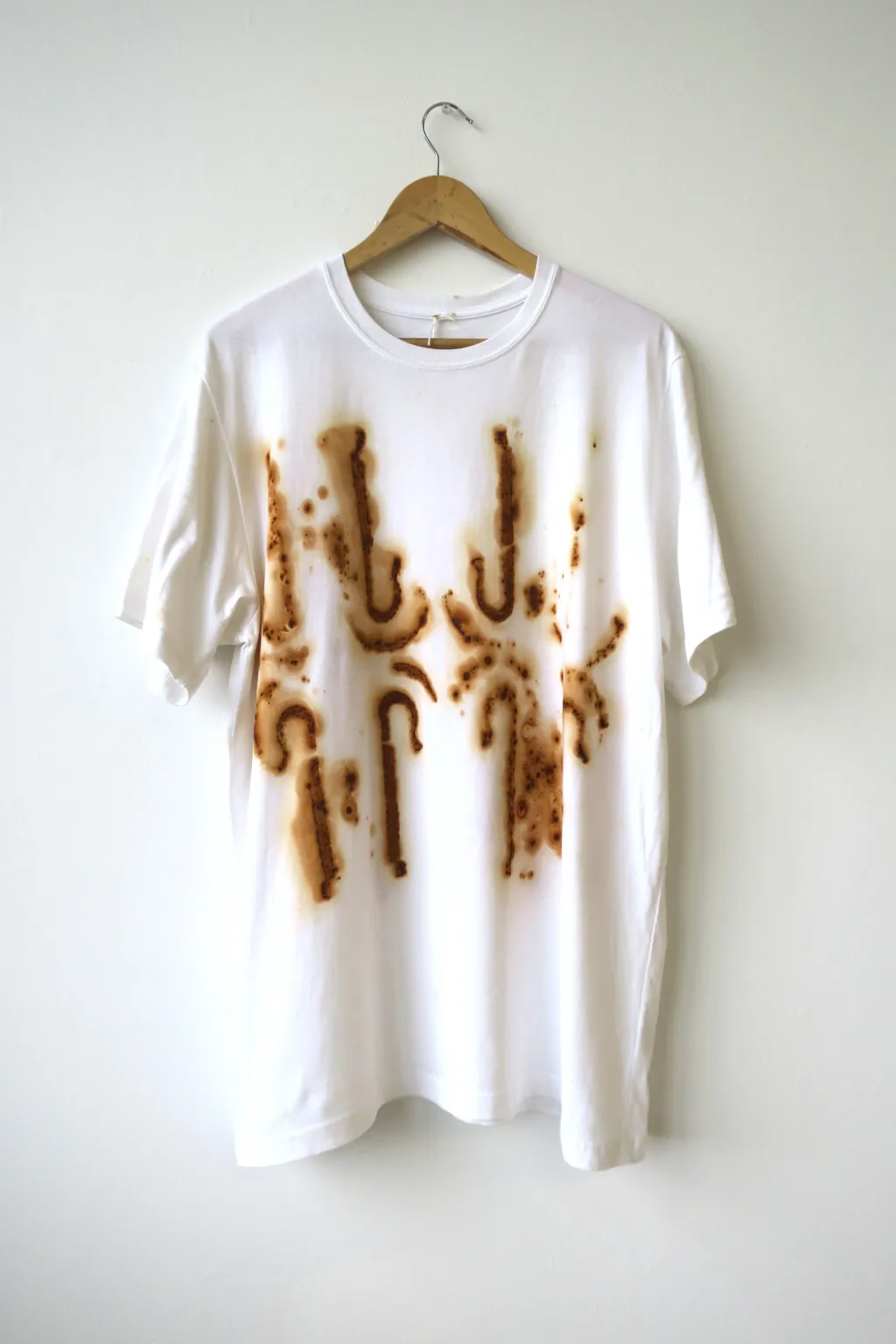 T-shirt blanc 100% coton imprimé avec des objets rouillés. Chaque chandail est unique.
