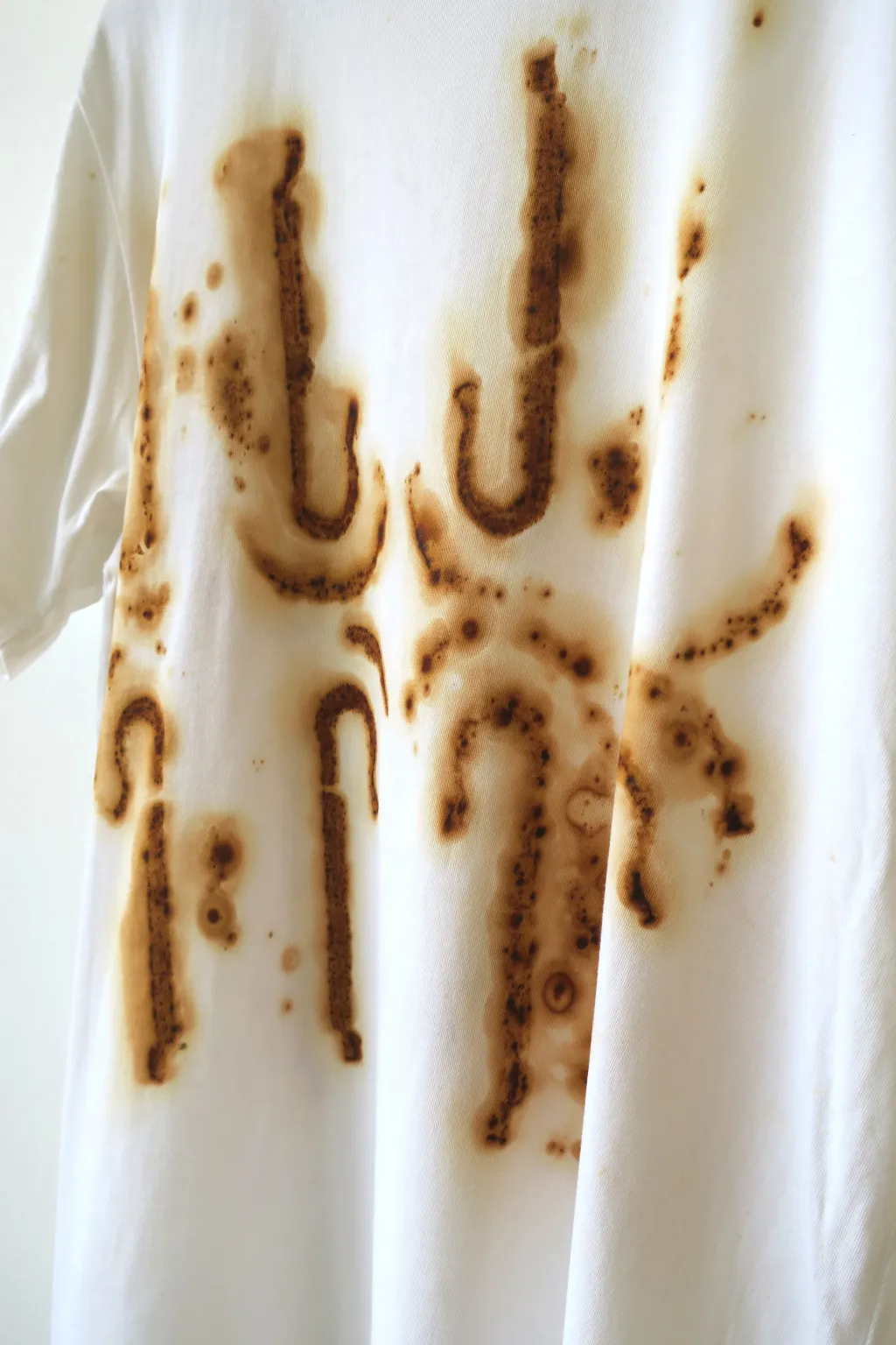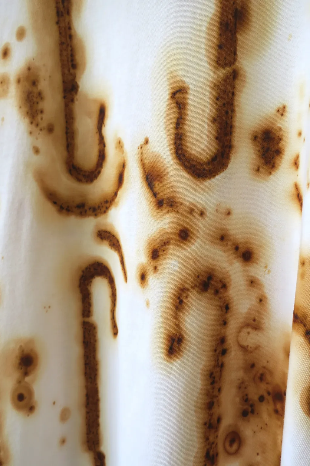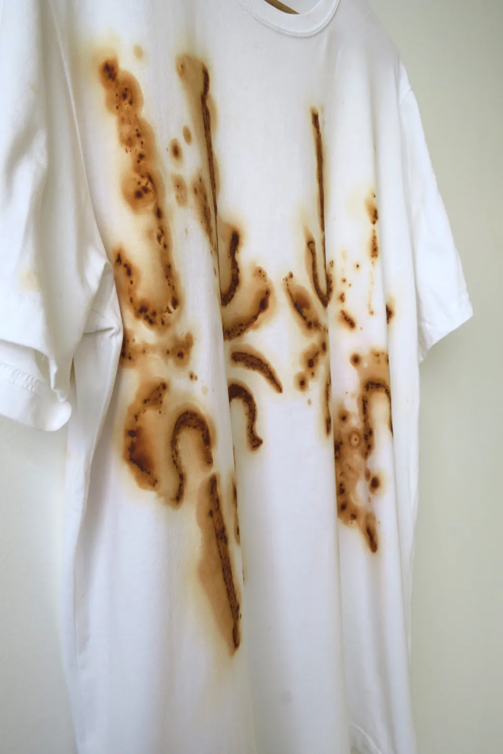 T-shirt blanc 100% coton imprimé avec des objets rouillés. Chaque chandail est unique.