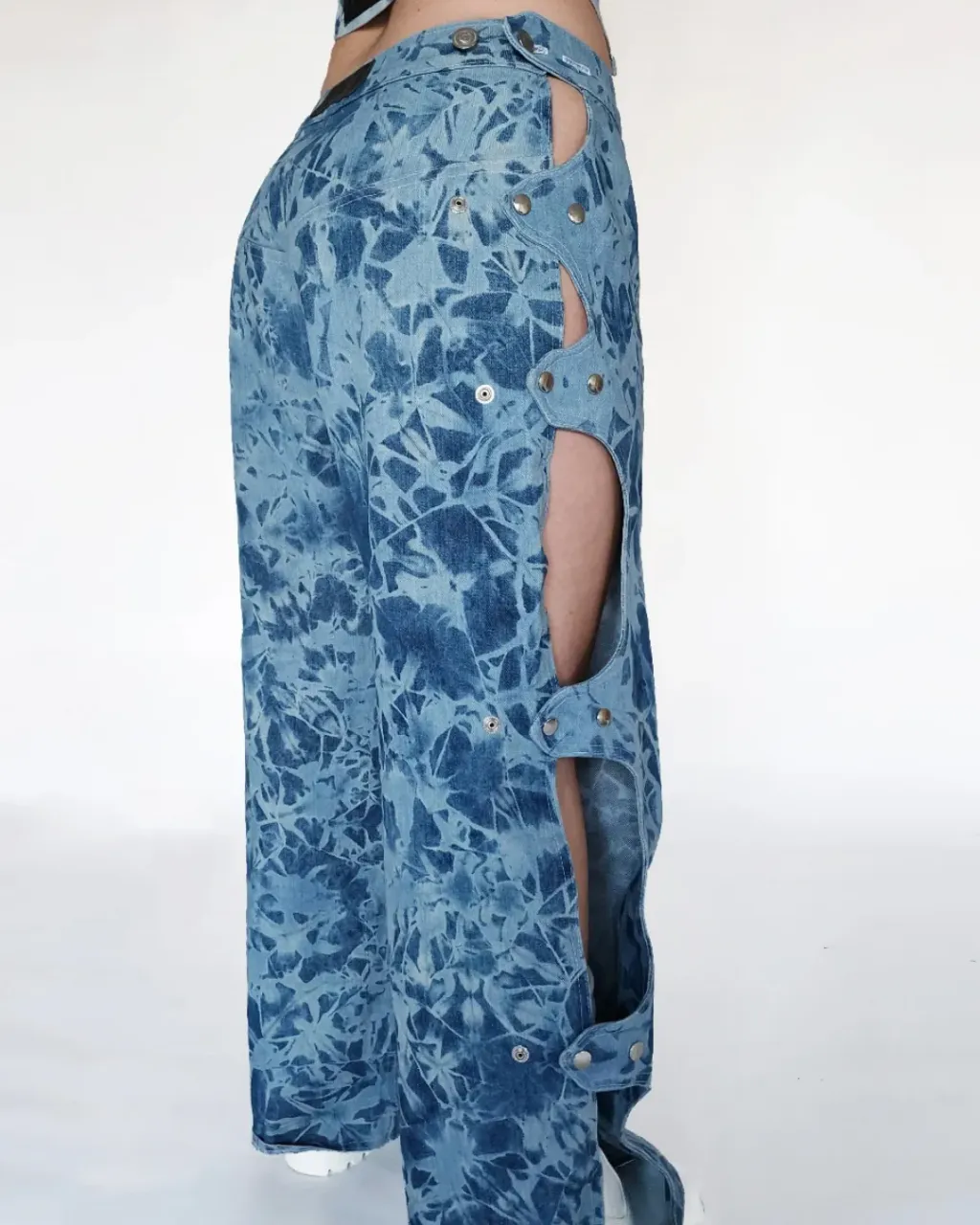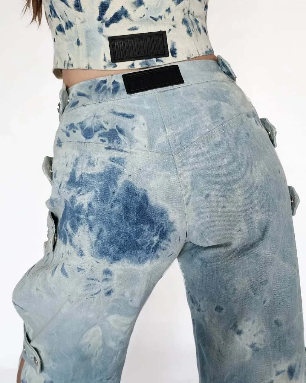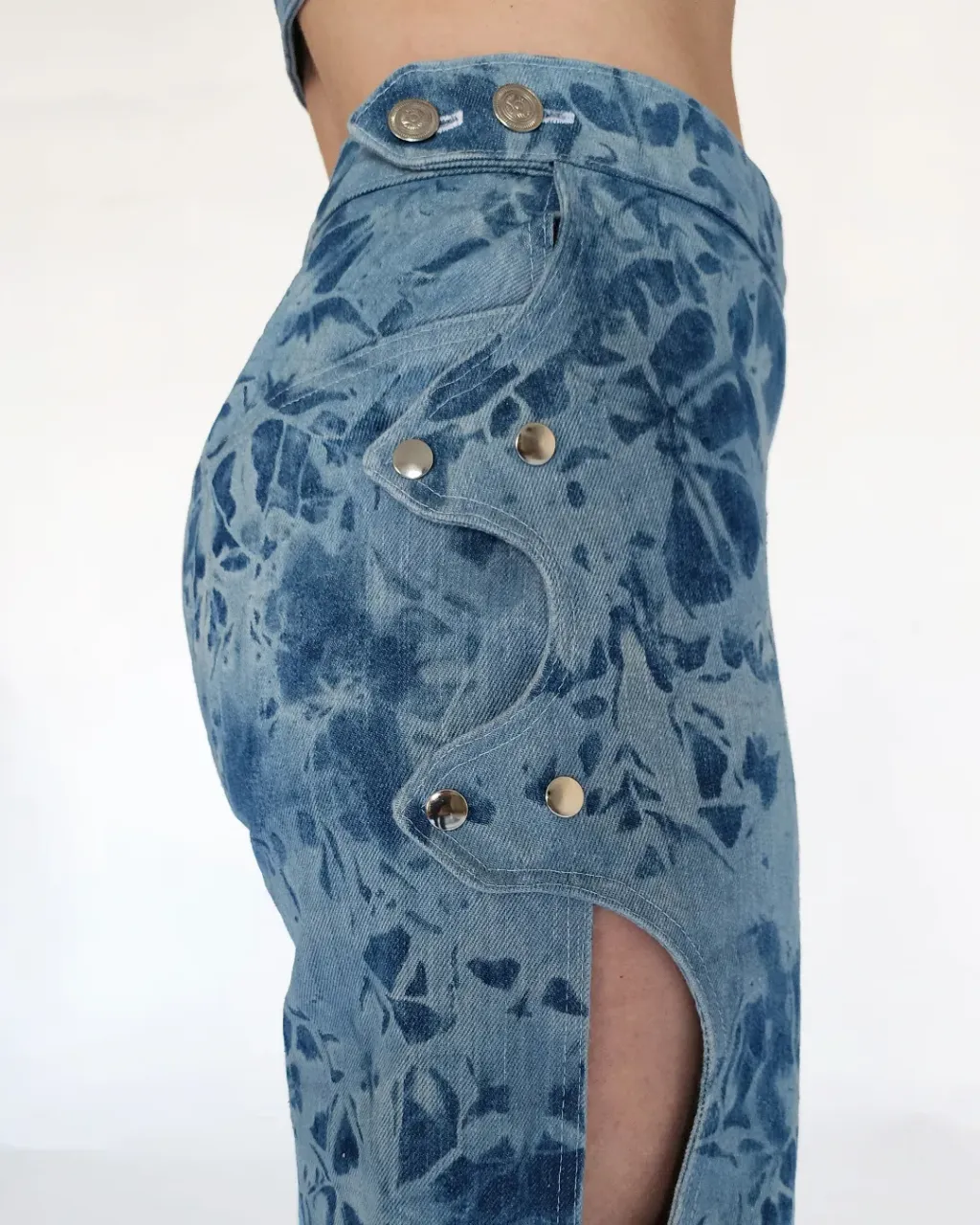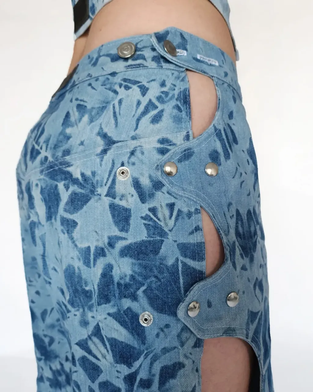 Jeans avec ouvertures sur les côtés, fermés par des boutons pression. Les jeans ont deux niveaux, ils peuvent être portés taille haute (moulant) ou taille basse (ample). Pour un look moulant taille basse il suffit de prendre une grandeur plus petite!