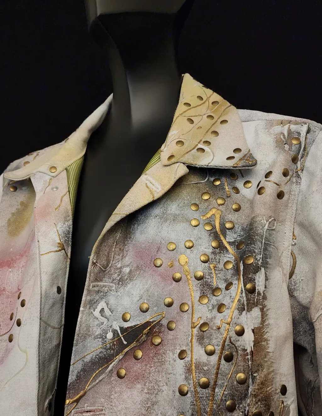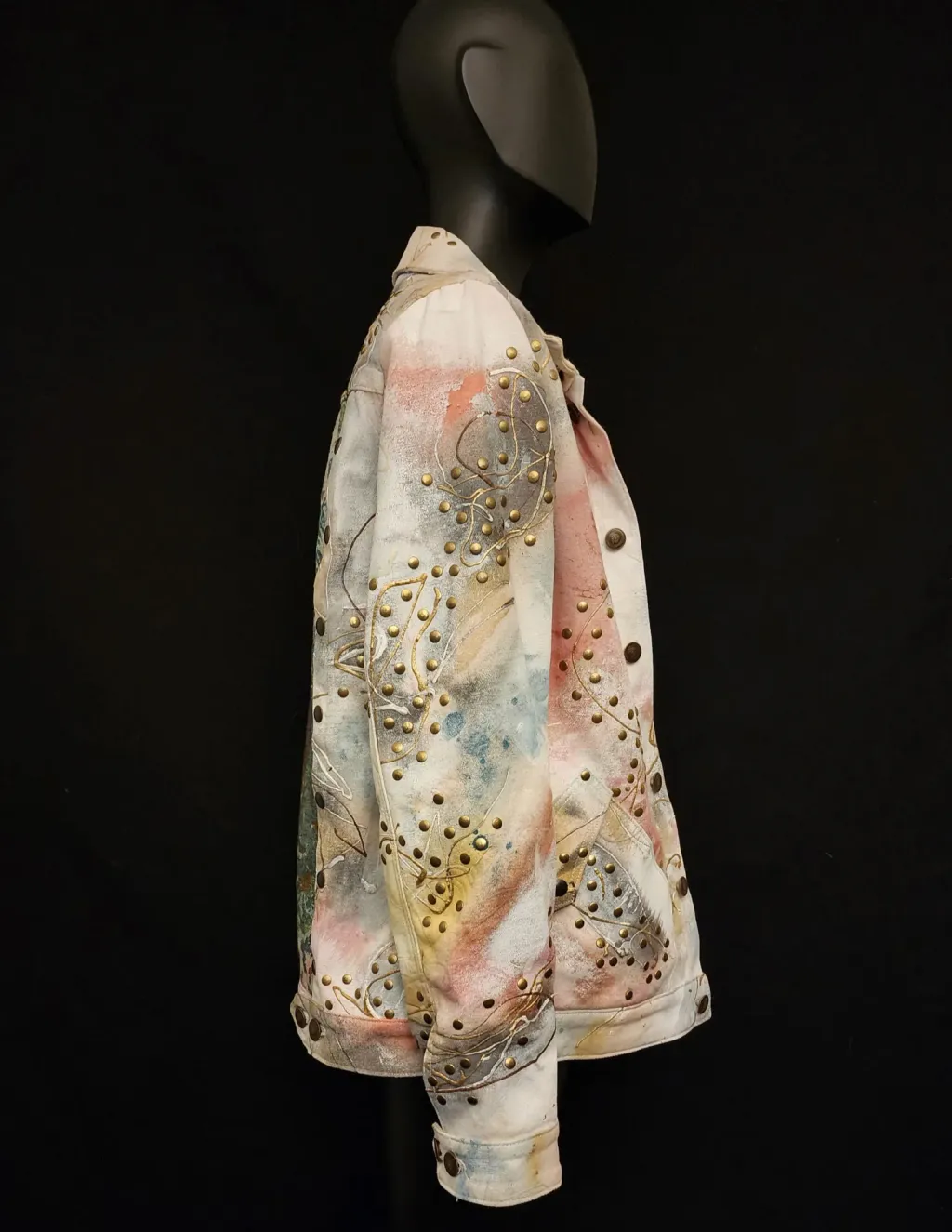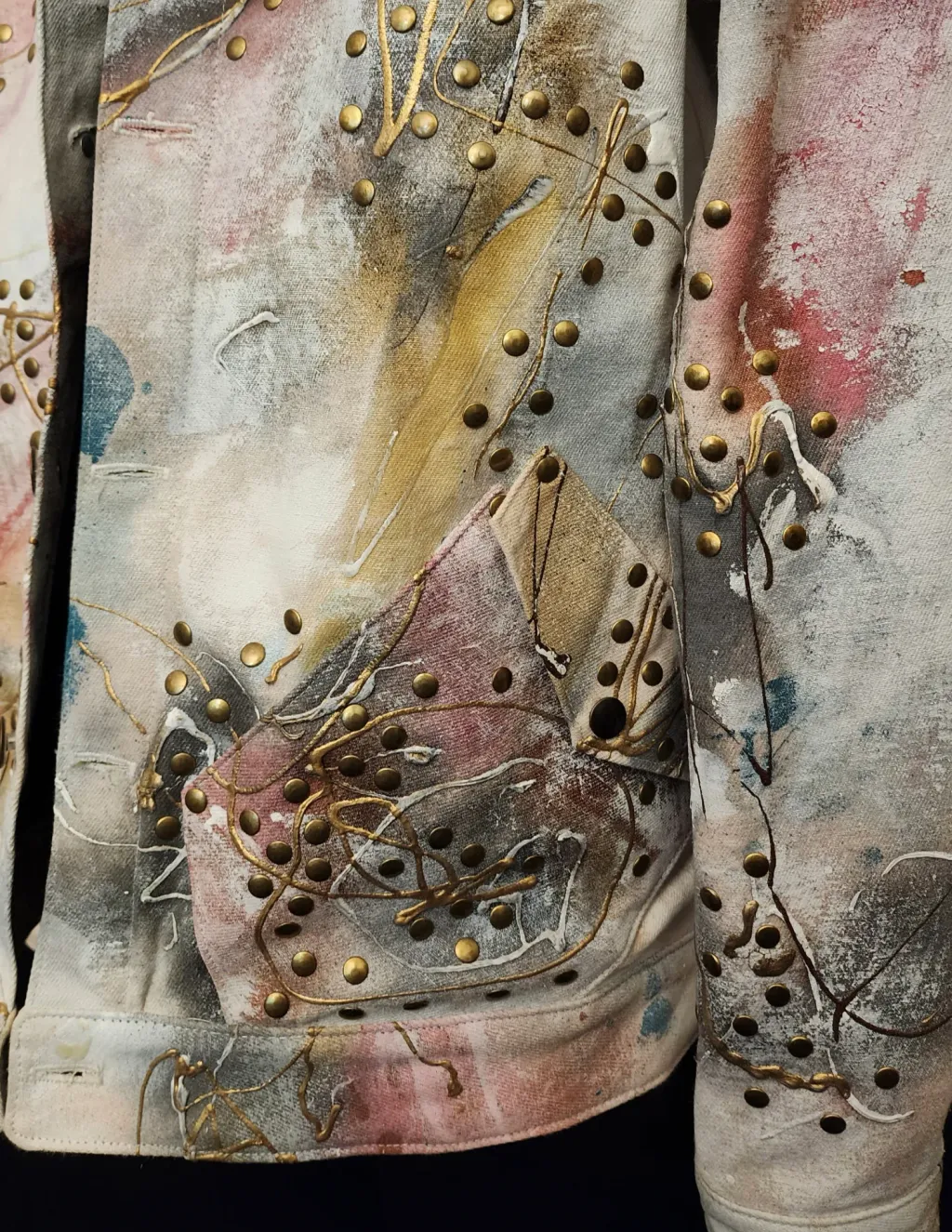 Veste en denim à coupe régulière peinte à la main par l'artiste Dominique Préfontaine, ornée de nombreux rivets.