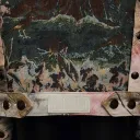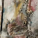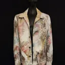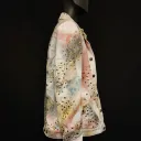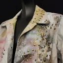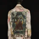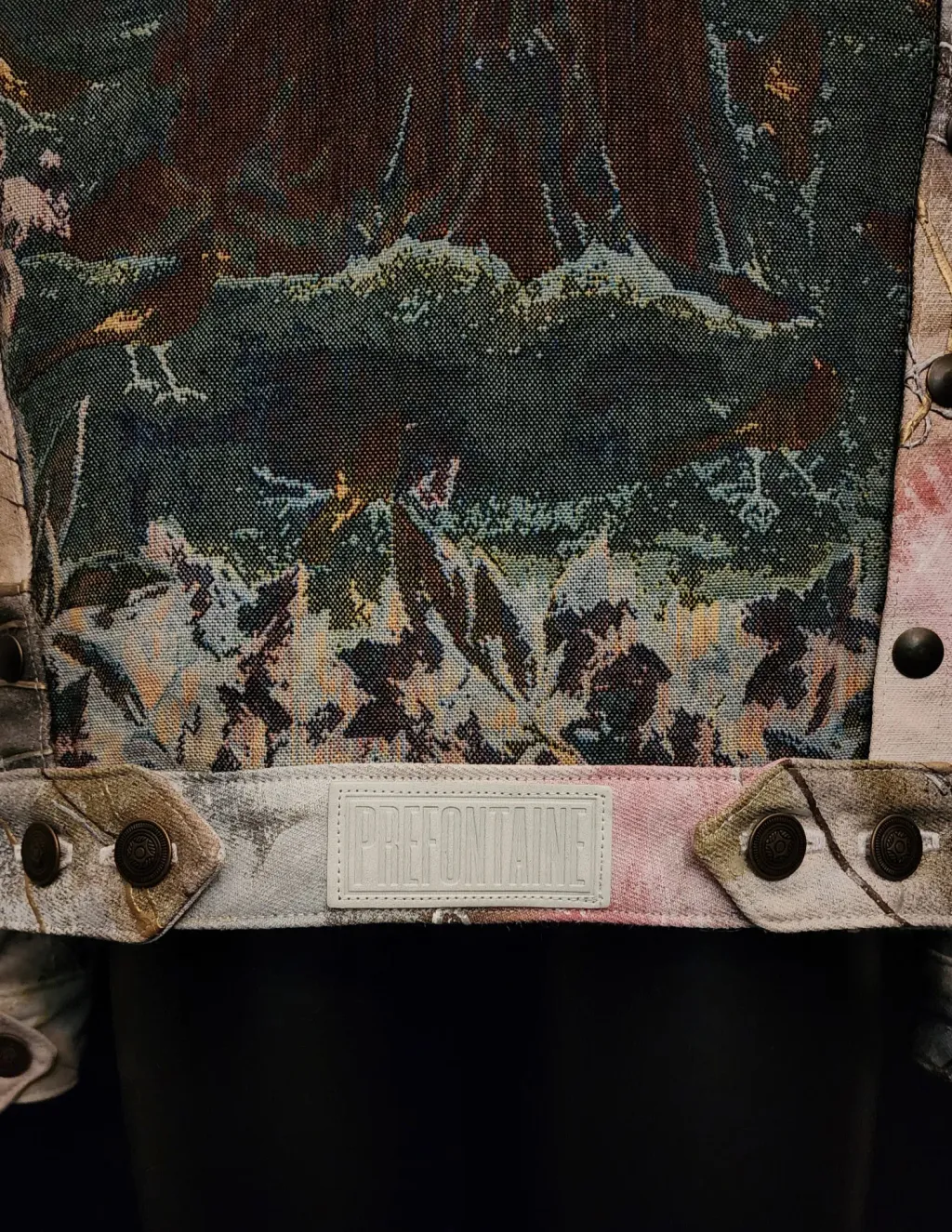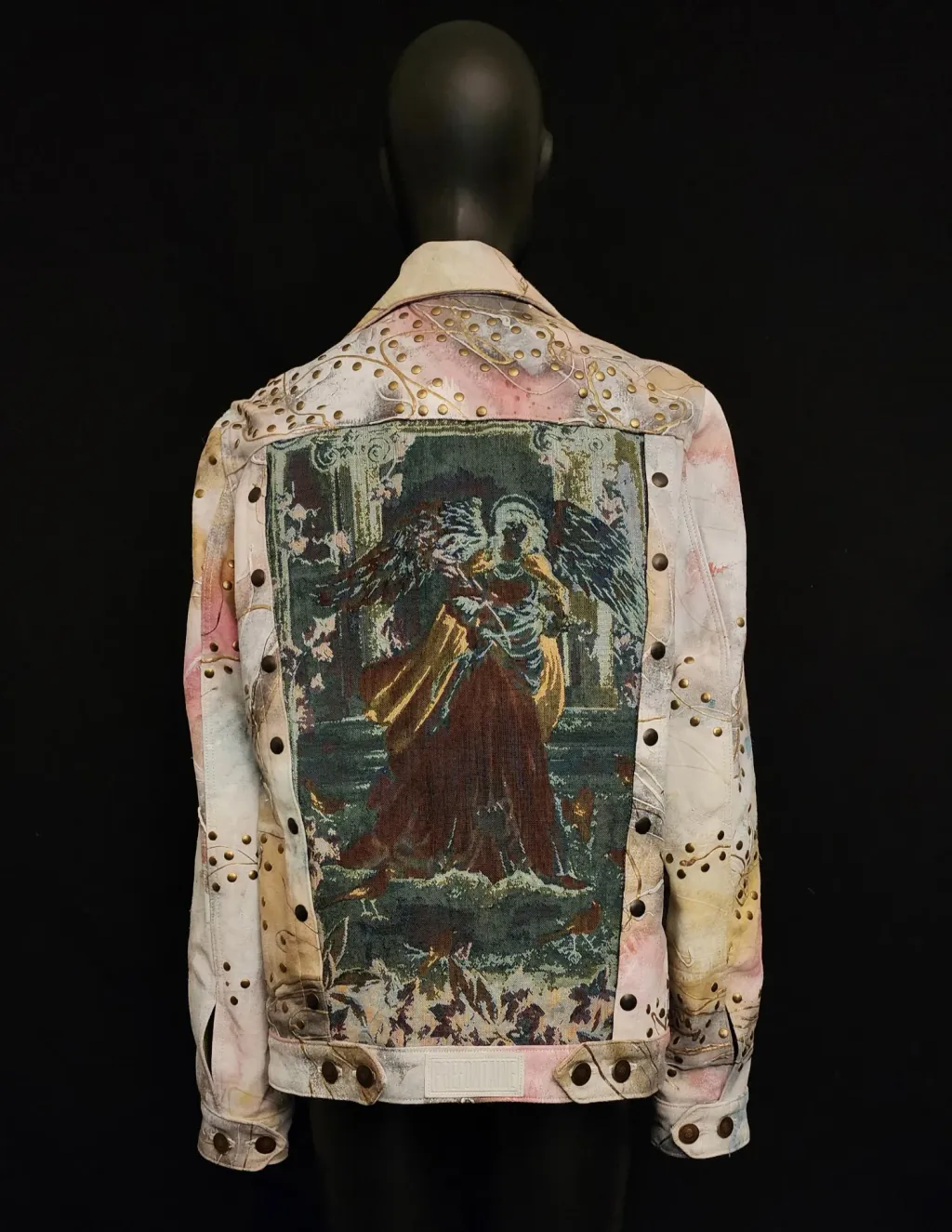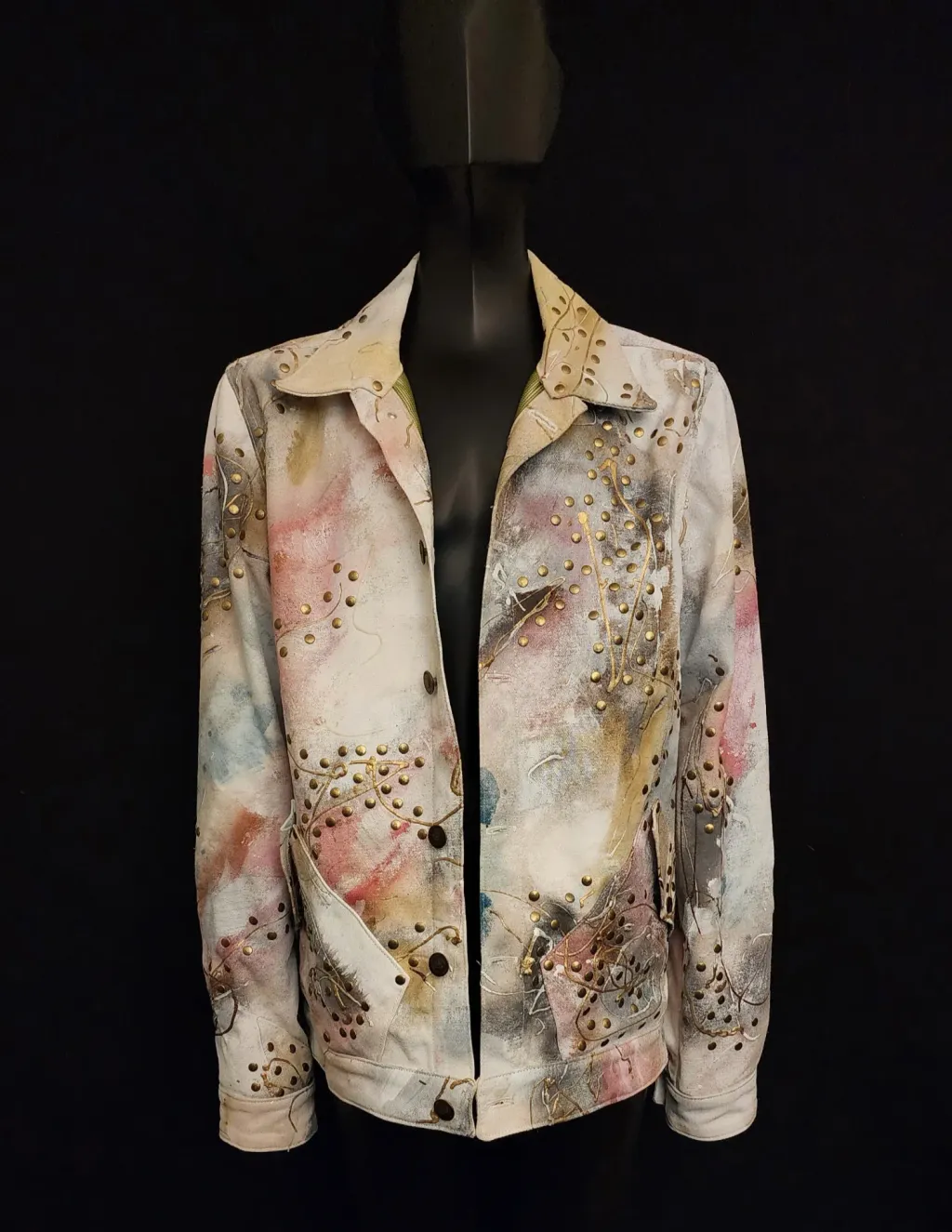 Veste en denim à coupe régulière peinte à la main par l'artiste Dominique Préfontaine, ornée de nombreux rivets.