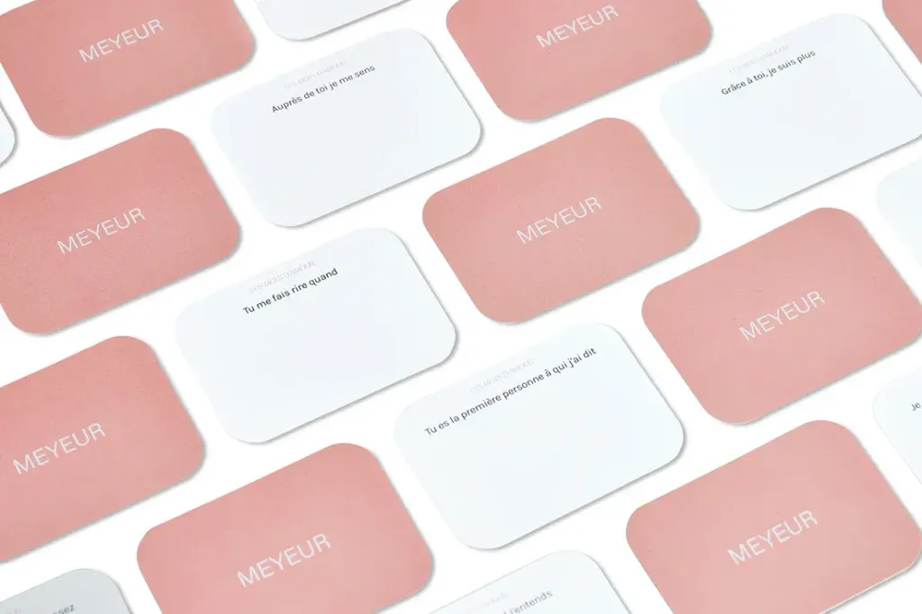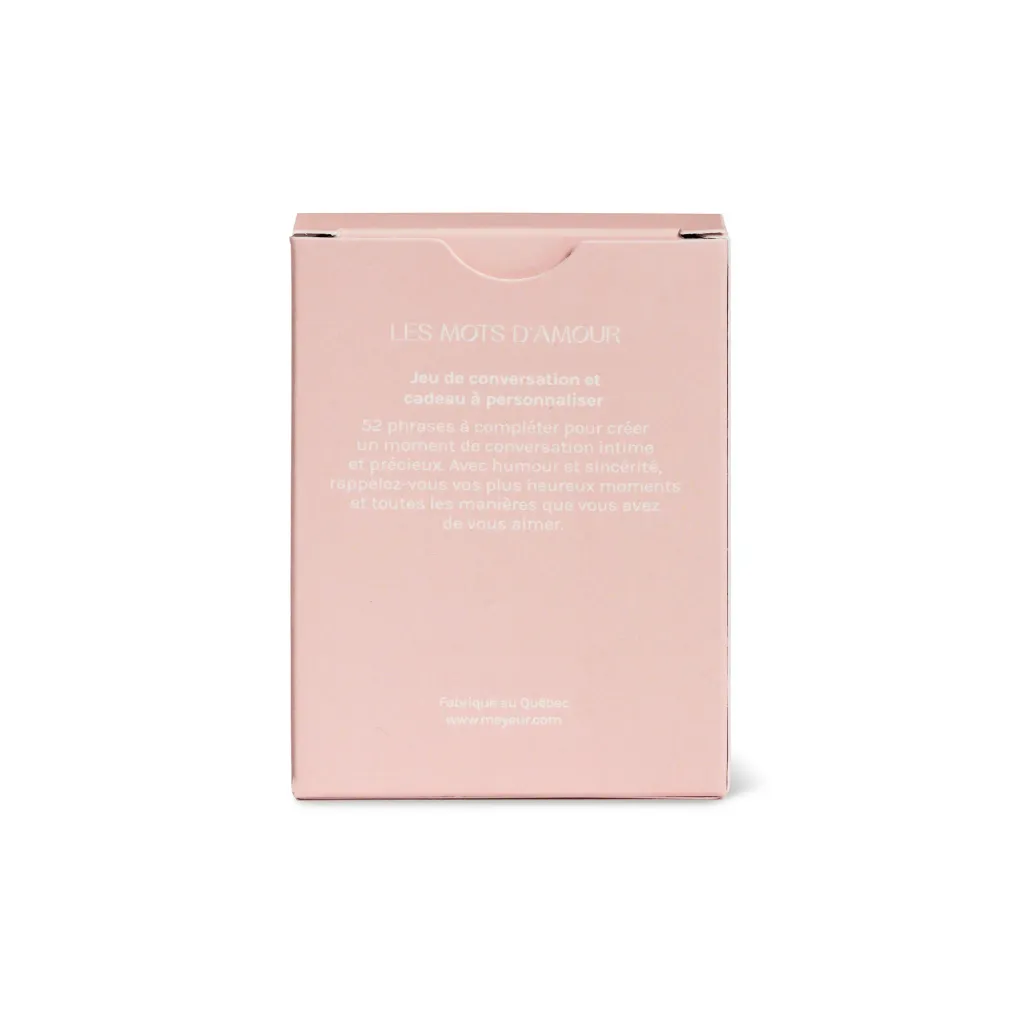 LES MOTS D’AMOUR est un jeu de conversation de 52 cartes ayant chacune une phrase à compléter pour vous rappeler toute la beauté de votre relation.