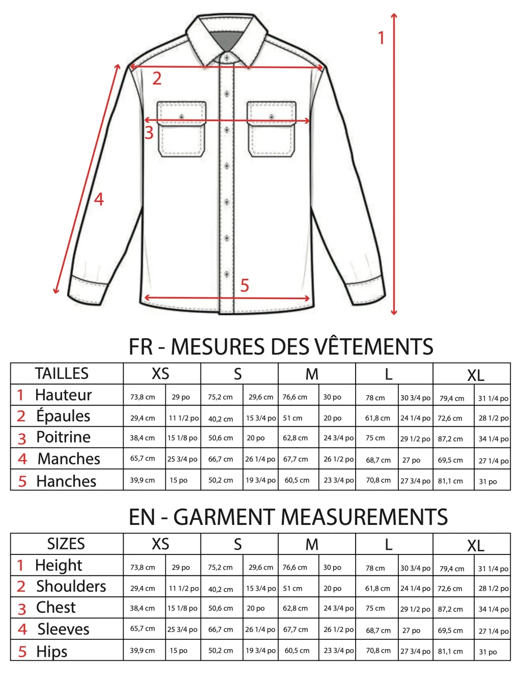 - Tous les tissus sont pré-rétrécis (la chemise peut aller à la laveuse et sécheuse sans problème)
