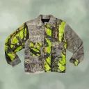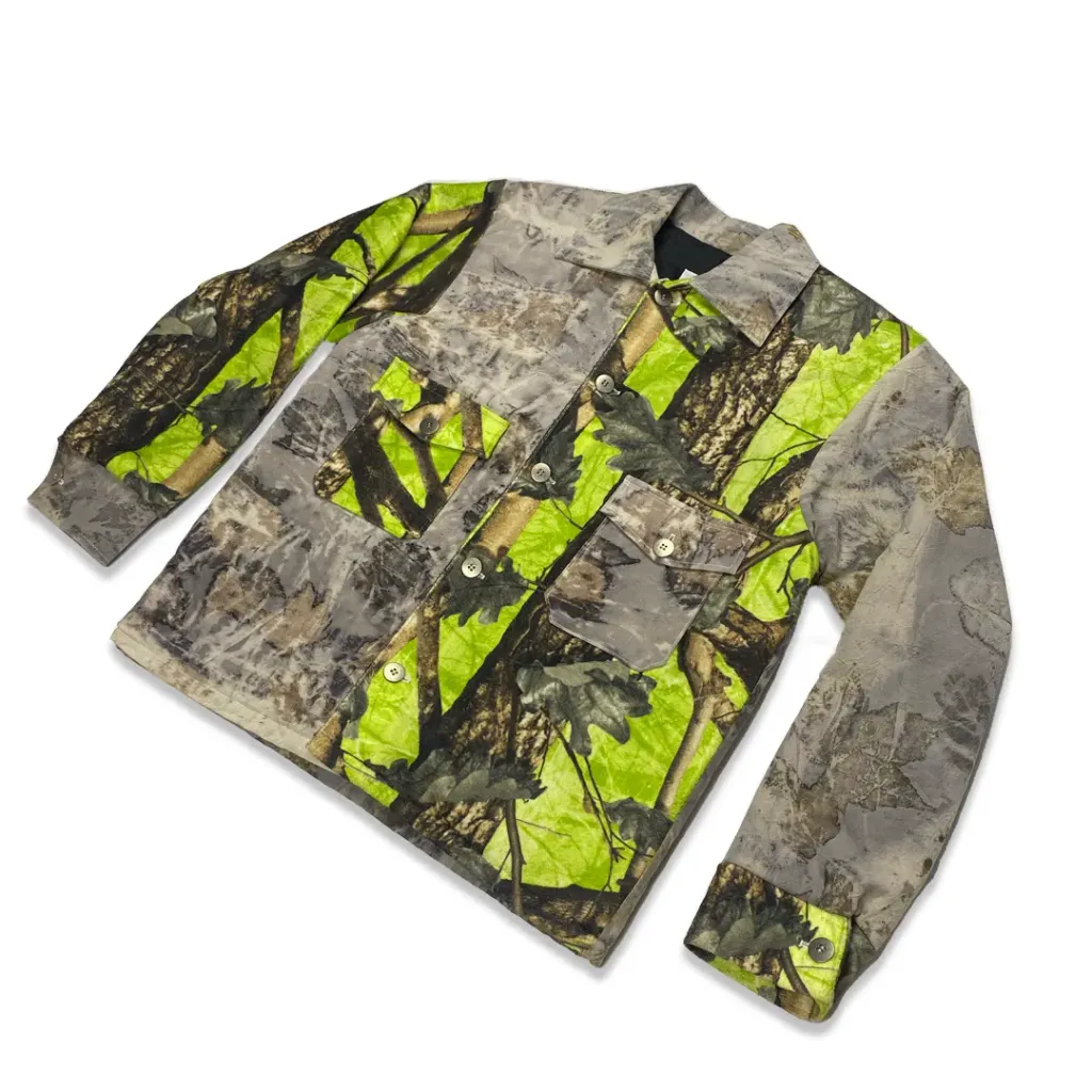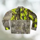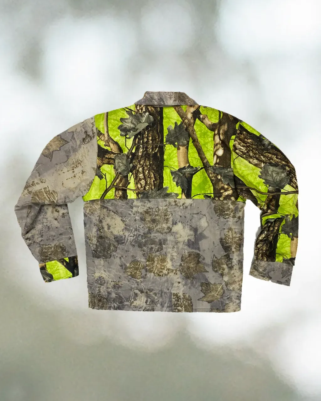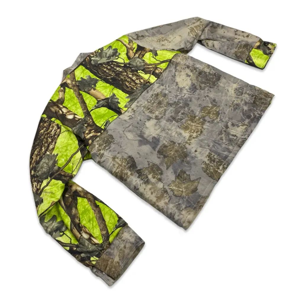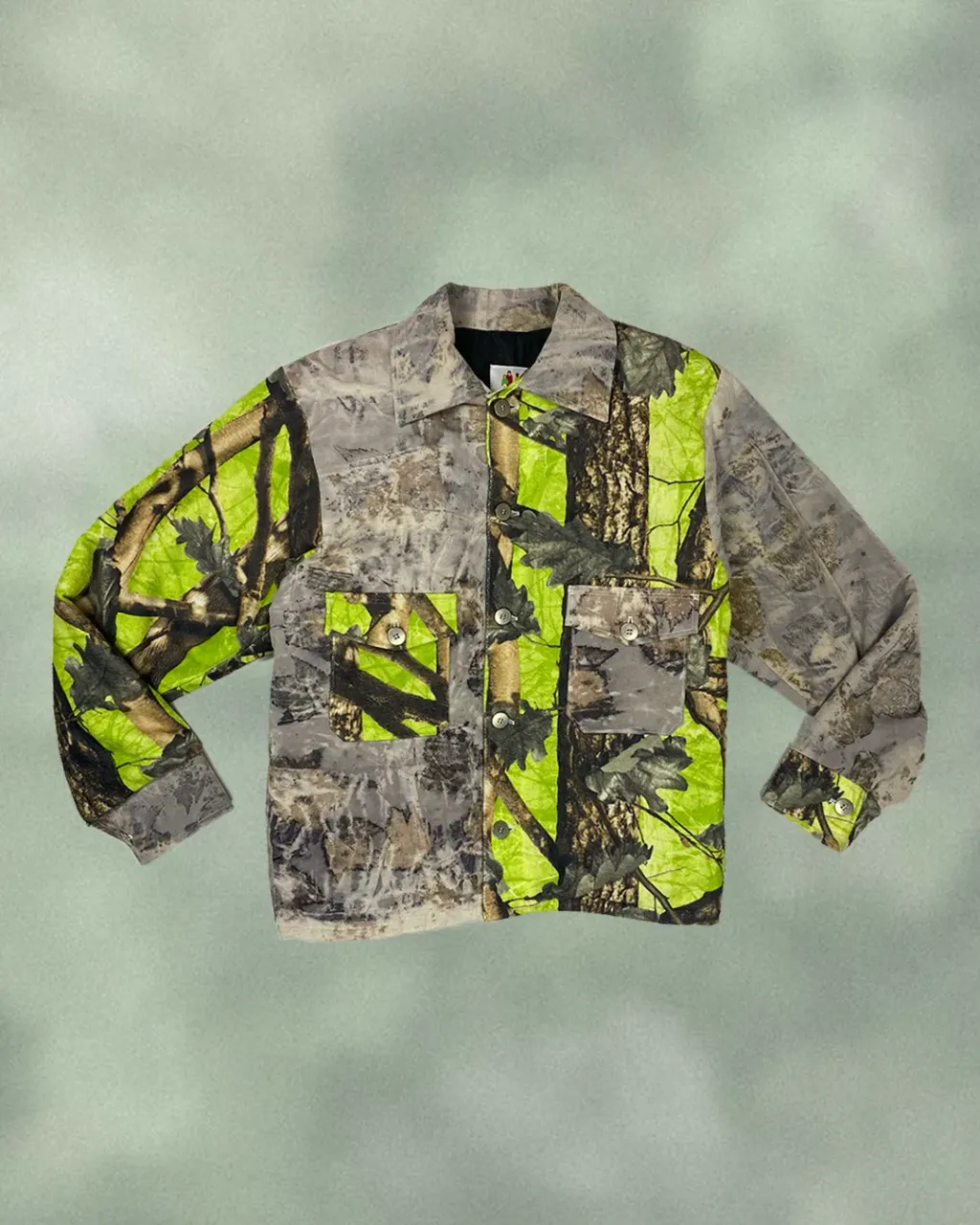 Tissu 1 : 100 % coton imprimé à partir de la technique de l'Eco-print. Cette technique est un procédé d'impression végétale par lequel des feuilles d'arbres (ou d'autres plantes) sont imprimées sur le tissu. Le résultat obtenu est différent d'une fois à l'autre et génère des images à la fois figuratives et abstraites, comme un camouflage tout à fait singulier.