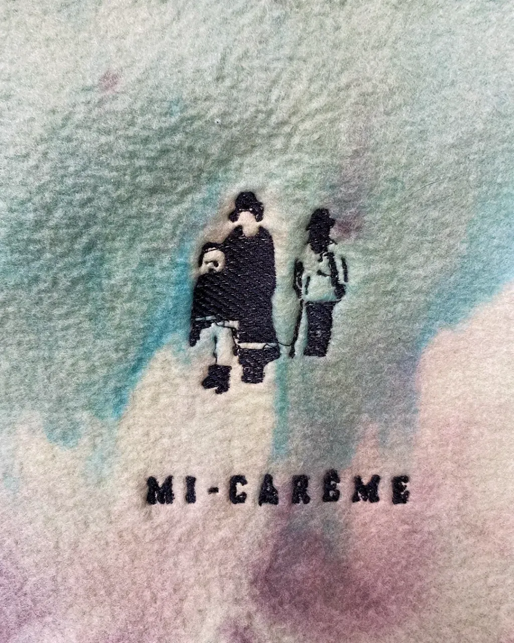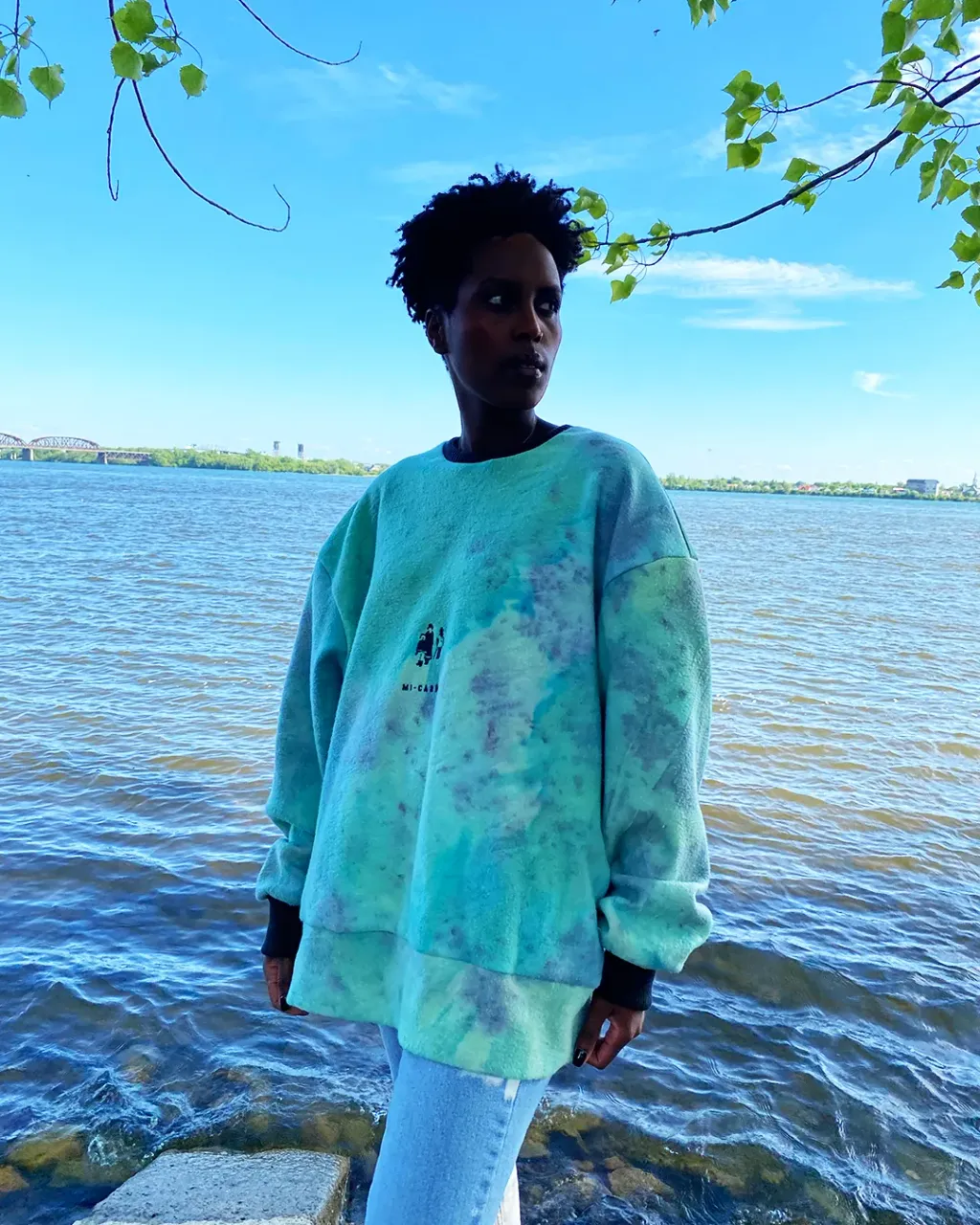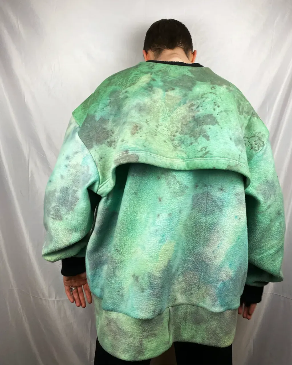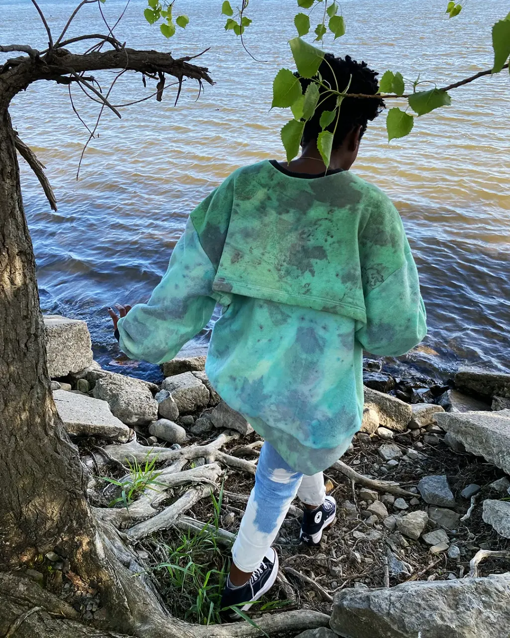 -Fabriqué en coton ouaté (100 % coton) et imprimé à partir de la technique de l'Eco-print. Cette technique est un procédé d'impression végétale par lequel des feuilles d'arbres (ou d'autres plantes) sont imprimées sur le tissu. Le résultat obtenu est différent d'une fois à l'autre et génère des images à la fois figuratives et abstraites, comme un camouflage tout à fait singulier.