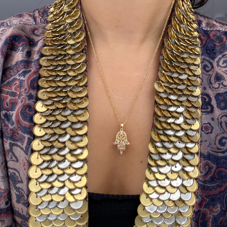 Ce magnifique collier Hamsa avec ses pierres colorées n'est pas seulement magnifique. De nombreuses cultures différentes croient que ce symbole vous protégera du mauvais œil. Protegez-vous avec style!