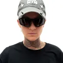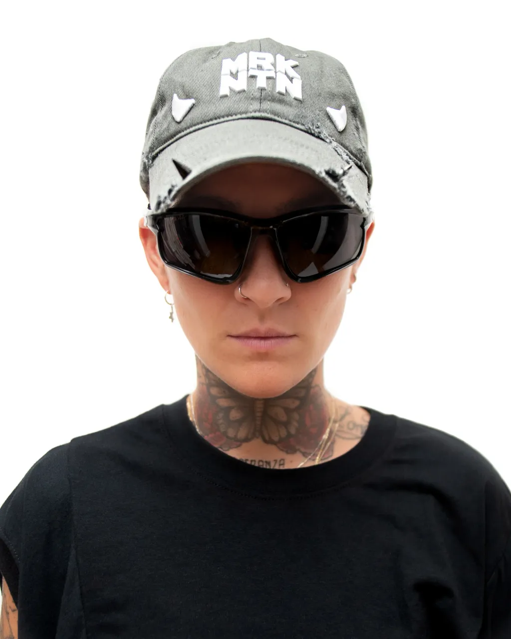 Casquette en sergé grise effet vieilli avec cornes de clous en métal. Visière incurvée. Oeillets brodés à la couronne. Logo en silicone blanc sur le devant. Cornes brodé dans à l'avant. Fermeture par pression blanche au dos.