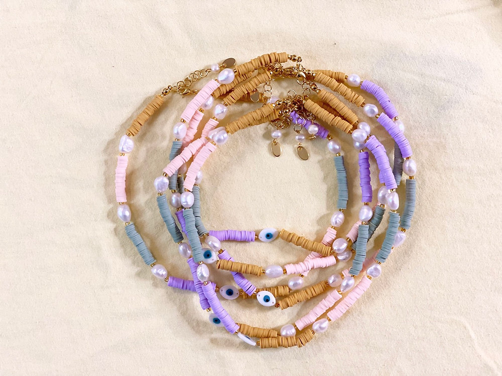 Ce magnifique collier en acier inoxydable plaqué or est composé de perles Heishi, de perles d'eau douce et d'une perle de nacre comme evil eye. Que tu le portes collier ou comme chocker, grâce à sa taille ajustable, tu peux le porter avec une tenue élégante ou une tenue décontractée pour ajouter la parfaite touche de sophistication!