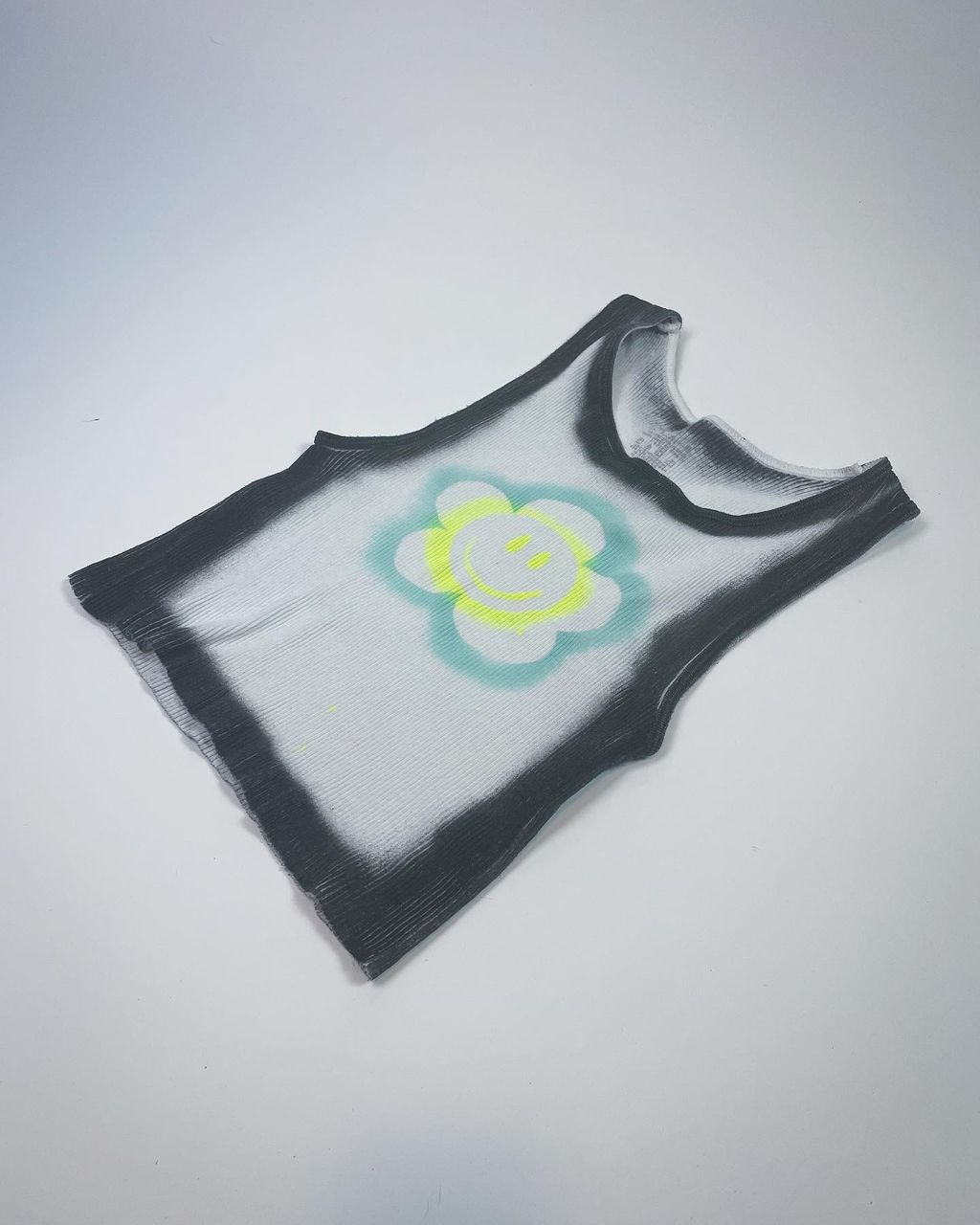 Retravaillé et peint à la main à partir du débardeur blanc classique, le débardeur Fleure Joyeuse est un retour au passé nostalgique et un complément parfait à une garde-robe fantaisiste. Habillez-le avec votre jupe préférée ou des sweats!