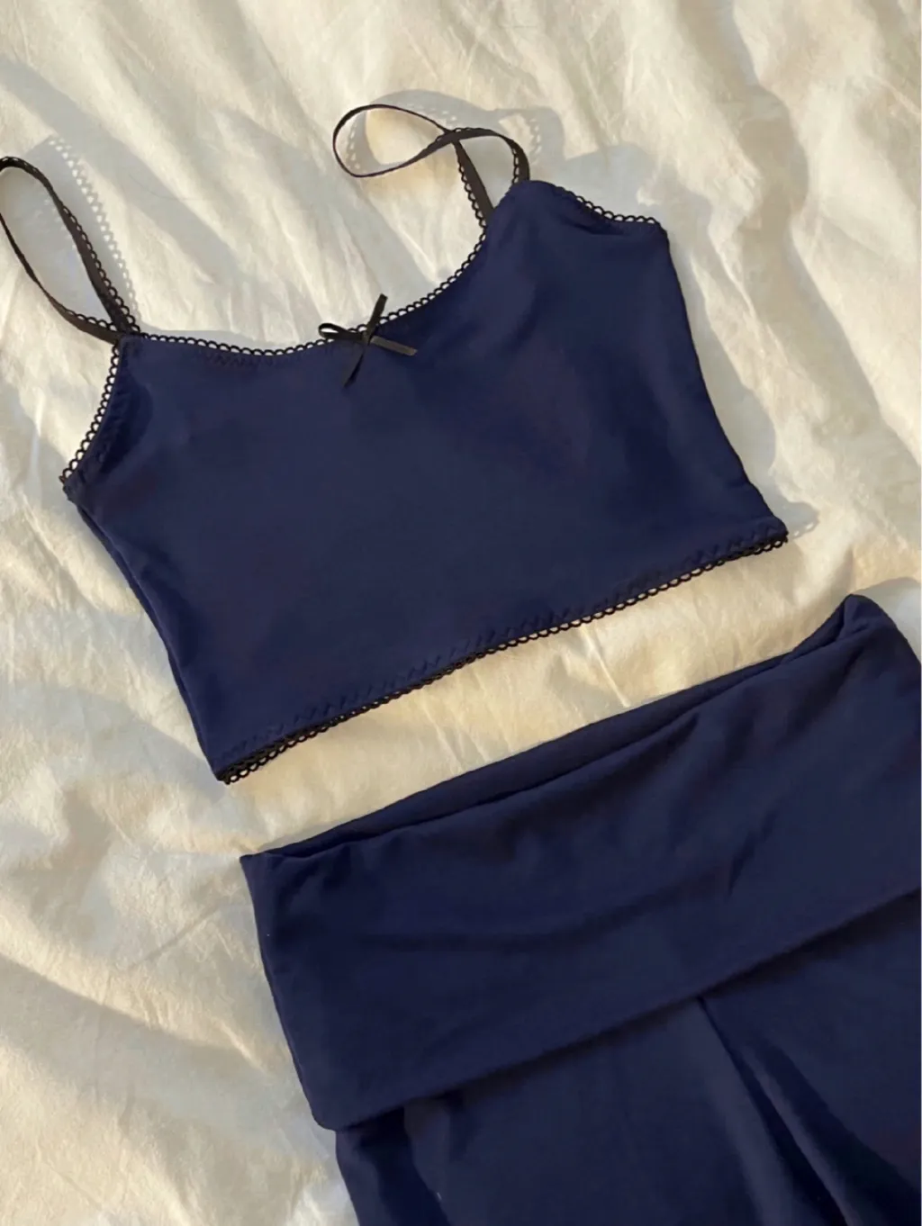 camisole marine courte avec élastique festonné et nœud en satin noir