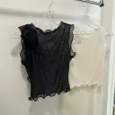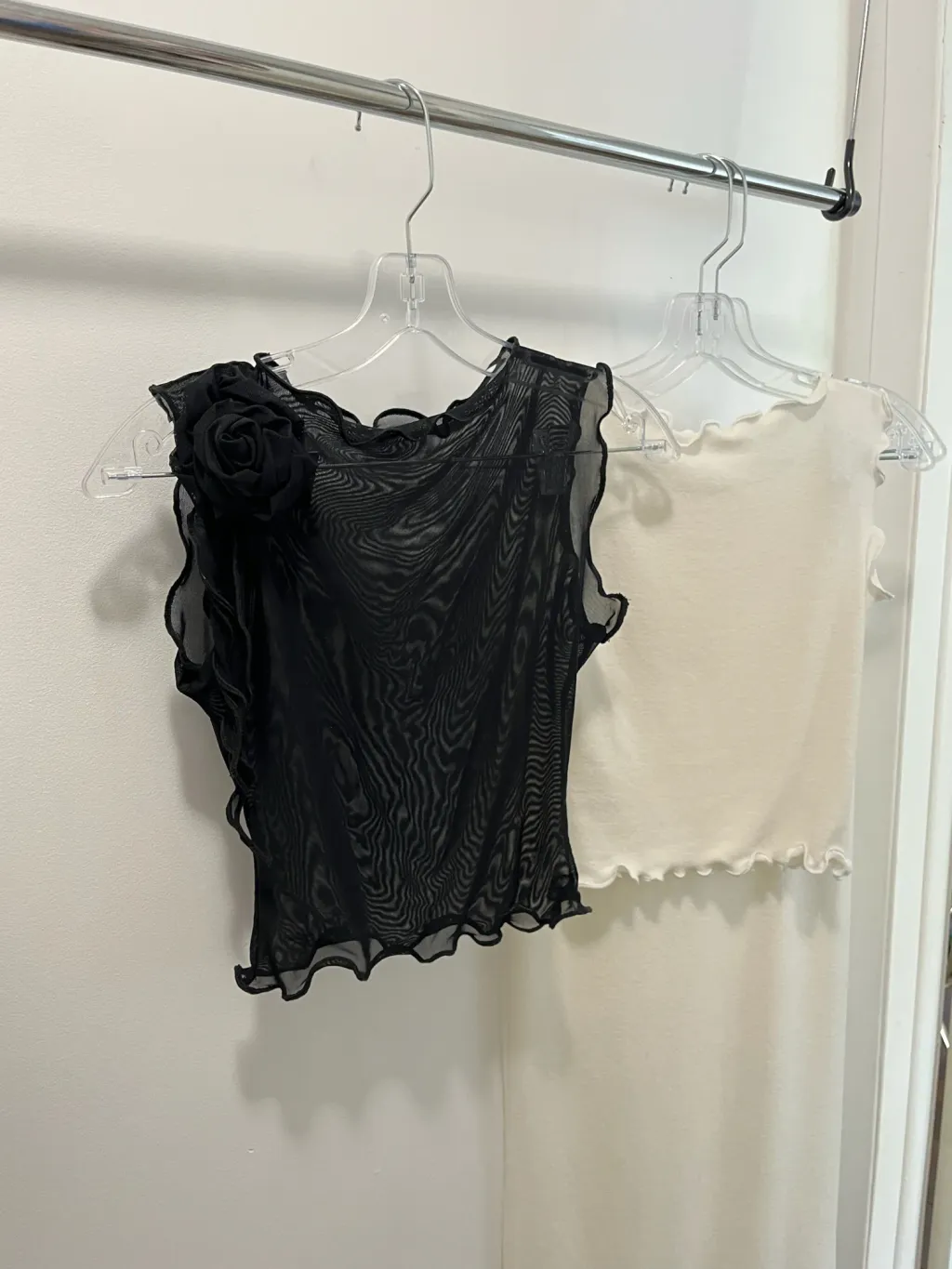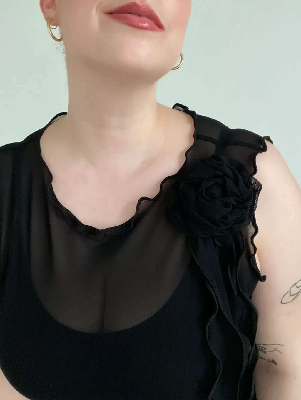 Top noir en maille extensible avec ourlets en laitue et détail de rose fait à la main